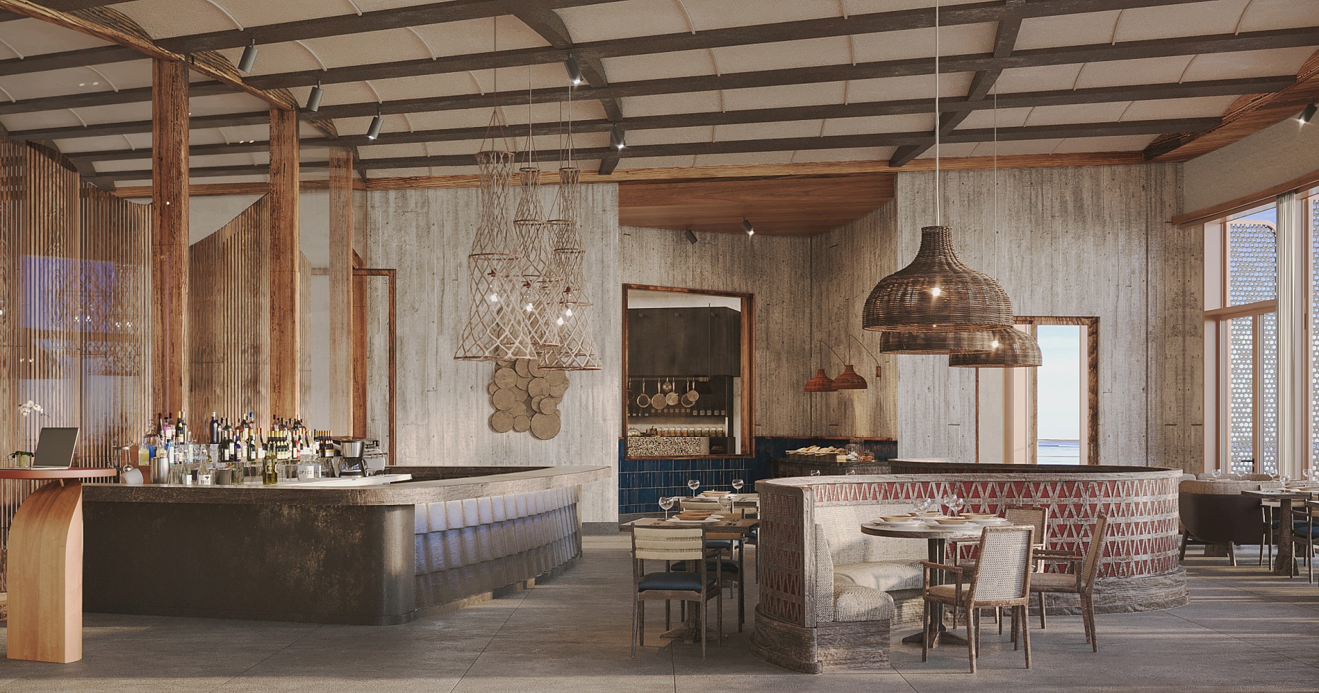 While adhering to brand standards the interior design was softened according to project location. The restaurant is situated within the wellness resort, with panoramic sea views. Therefore softer shapes and textures were introduced to tone-down the roughness of the brand and create a harmonious continuation of the resort experience.