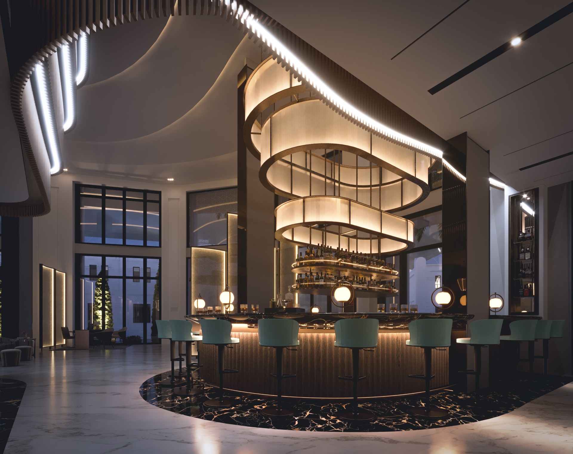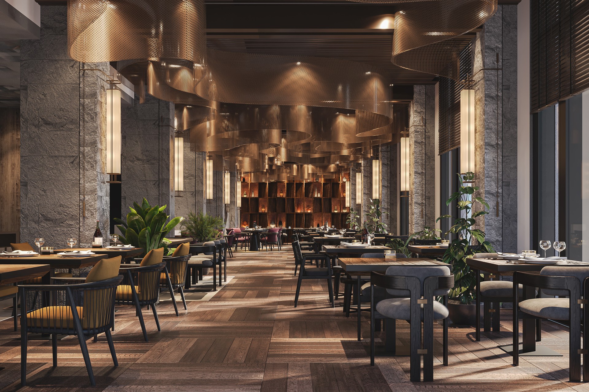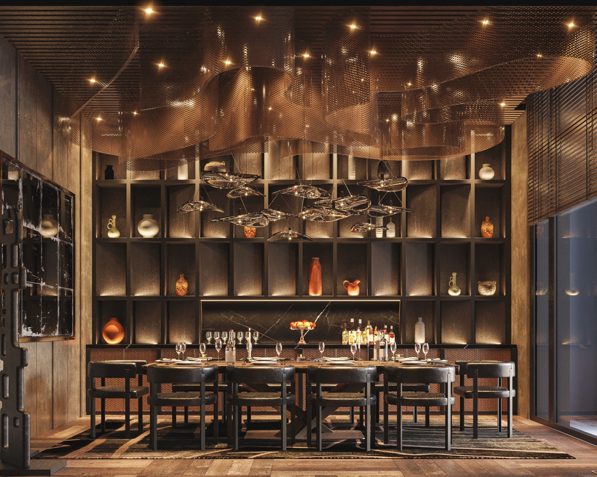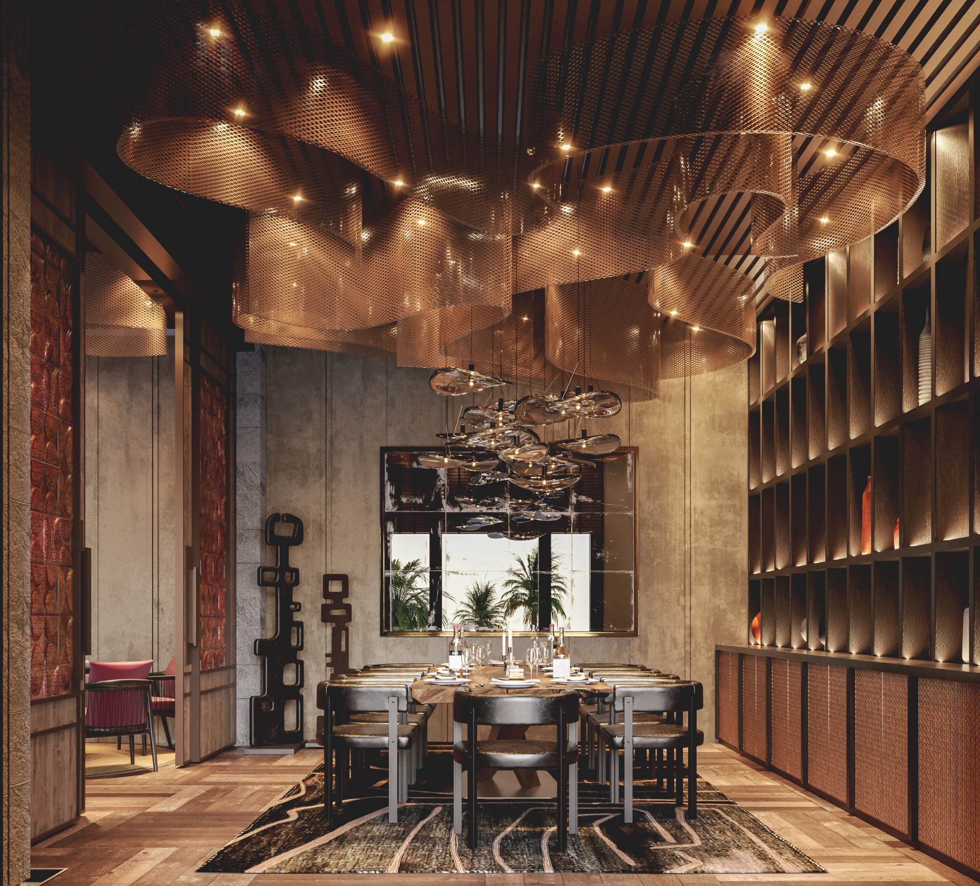 يُبرز التصميم الداخلي لوحة ألوان ترابية وملموسة، تجمع بين الأخشاب الخام والحجر المُزخرف والأقمشة العضوية الناعمة. تُعزز إضافة الأنماط التجريدية المُصممة خصيصًا والأعمال الفنية المُستوحاة من خطوط الحبر في جميع أنحاء المطعم روح التصميم البدائية والقبلية