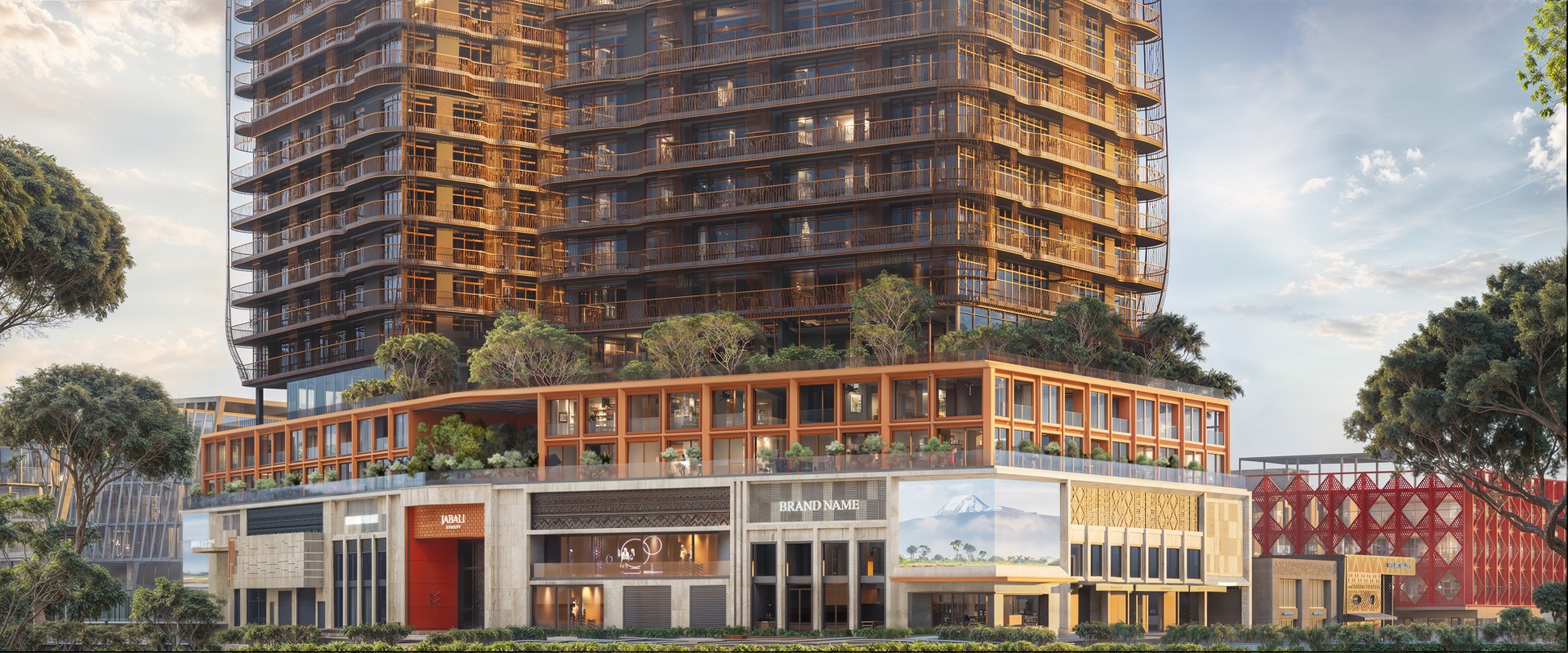 At the core of the architectural identity are the Jabali Towers, a pair of iconic buildings whose design draws inspiration from Kenya’s natural wonders. One option references the Baobab tree, featuring organic curves and earthy tones that stand as sculptural statements within the city. Another variation pays tribute to Kenya’s mountain ranges, using verticality and layered textures to express strength, rootedness, and ascent.