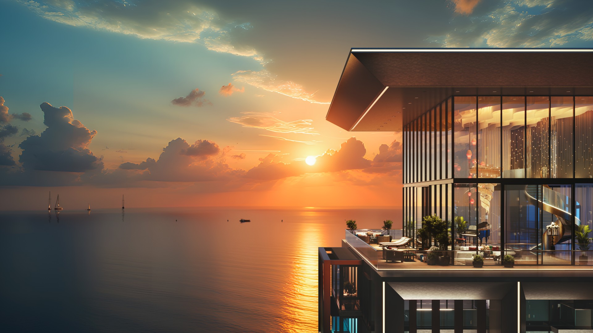 Transitioning into the living area, the design philosophy revolves around balance and material contrast. A neutral color palette of soft beige and earthy tones is strategically accented with black details, adding depth and definition to the space. Expansive floor-to-ceiling windows frame panoramic sea views, fostering a direct connection between the interior and the surrounding natural landscape. This interplay between interior and exterior spaces is a defining characteristic of high-end Residential Design.