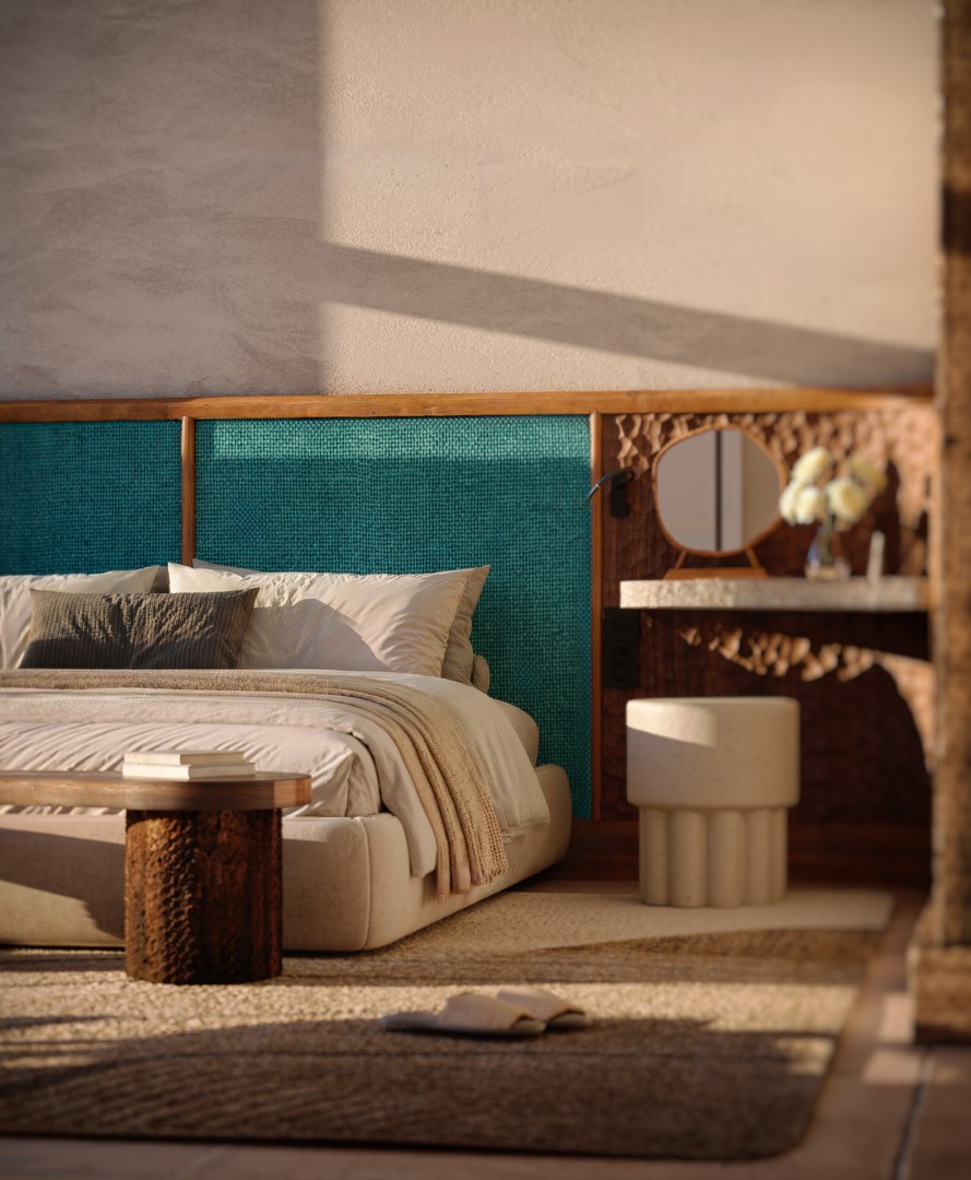 A neutral color palette evokes a sense of calm, blending earthy tones with soft hues to create a serene and welcoming atmosphere. Natural materials, sourced locally, are thoughtfully incorporated throughout, connecting the interior with the surrounding landscape. From smooth timber finishes to stone accents, every detail reflects the area’s coastal heritage. The tranquil aesthetic extends into the resort’s public areas and villas, where the design embraces clean lines, open spaces, and an uncluttered layout, fostering a sense of calm and openness. Lush greenery, carefully curated to complement the environment, enhances the peaceful ambiance, ensuring guests feel immersed in nature. This harmonious blend of local inspiration, functional design, and soothing materials provides a sanctuary where guests can unwind and reconnect with themselves and the natural world around them.