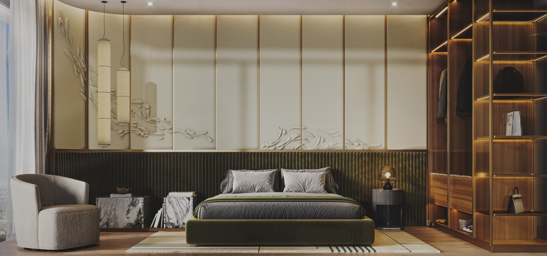 NEXT Gardens is thoughtfully inspired by local nature and the surrounding coastal landscape. Situated by the seaside, the architecture integrates lush greenery directly into its facade, creating harmony between the built environ- ment and natural surroundings. Interiors reflect this ethos through the signa- ture olive green palette, complemented by natural materials and earthy tones, ensuring residents always feel closely connected to nature.