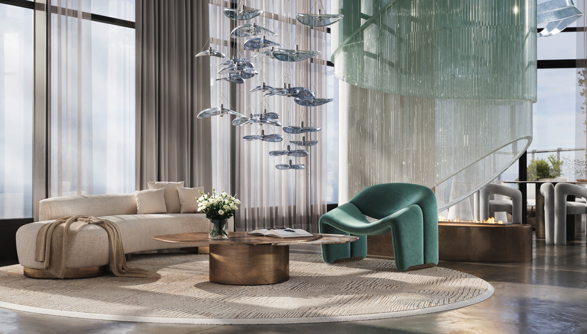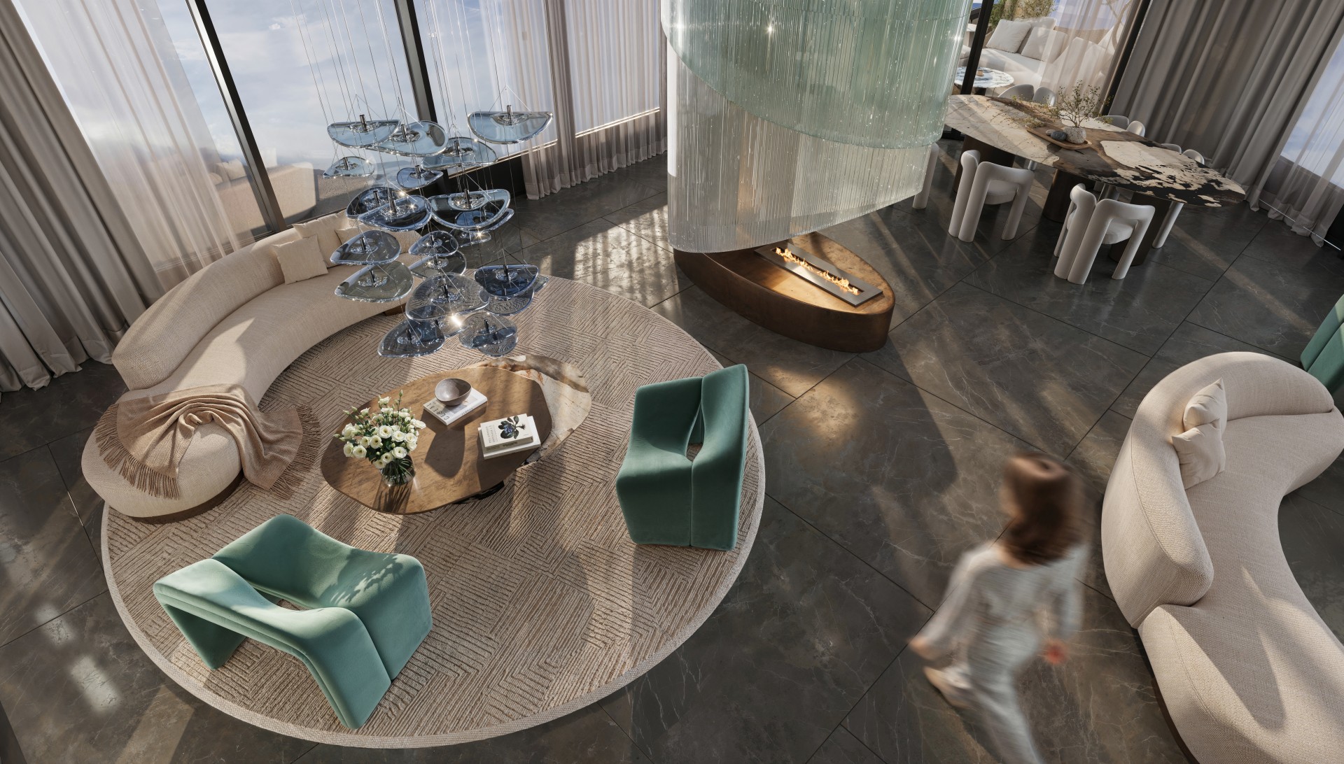 The living area is the heart of the penthouse. Bespoke furnishings and curated décor add individuality and charm. Every detail, from high-end finishes to carefully placed textures and colors, evokes comfort and sophistication.