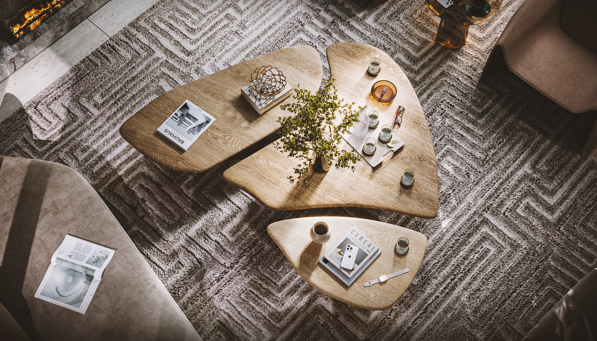 stone, and metal, are woven throughout the spaces to further connect the interiors with the surrounding landscape. This thoughtful approach to Residential Architecture emphasizes balance, ensuring that every element—from furniture to finishes—works harmoniously to create a cohesive and welcoming environment.