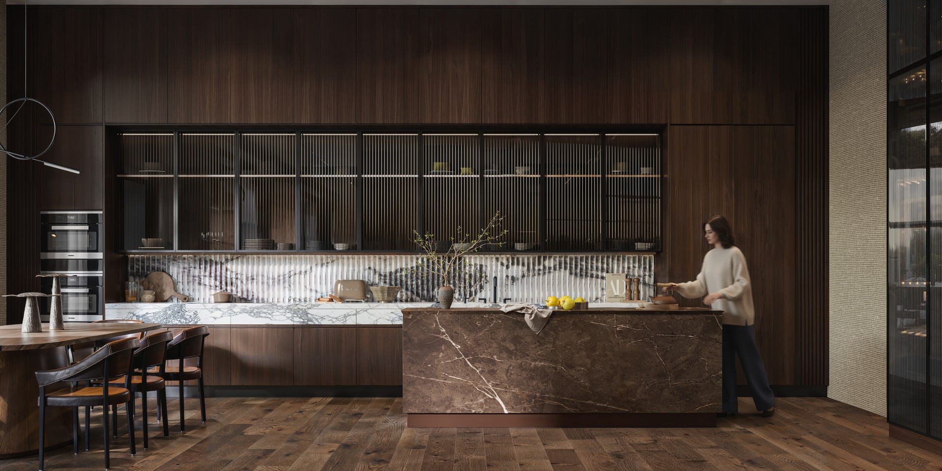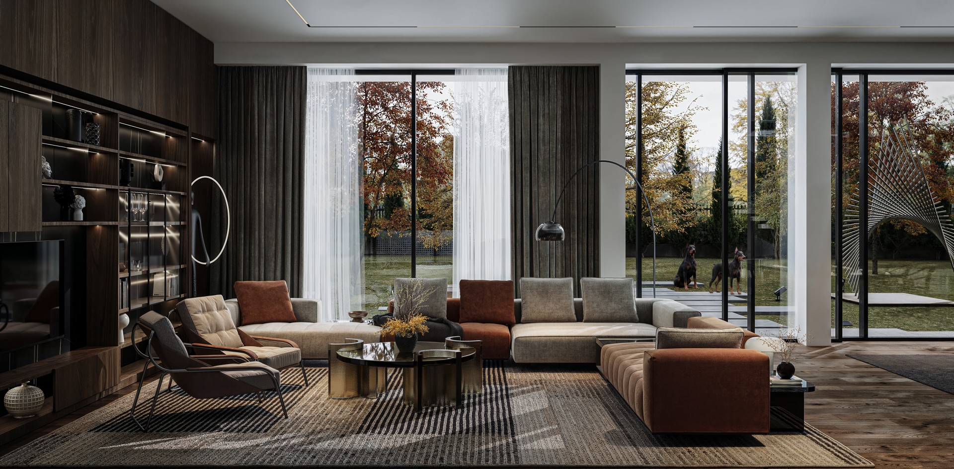 The interior design of this Residential Architecture private house embodies modern sophistication and a seamless connection between architecture, art, and nature. Vast open spaces create a sense of grandeur, amplified by high ceilings that invite abundant natural light. The expansive layout fosters fluid movement between key living areas while maintaining a harmonious balance between functionality and aesthetics—an essential principle of Residential Architecture.