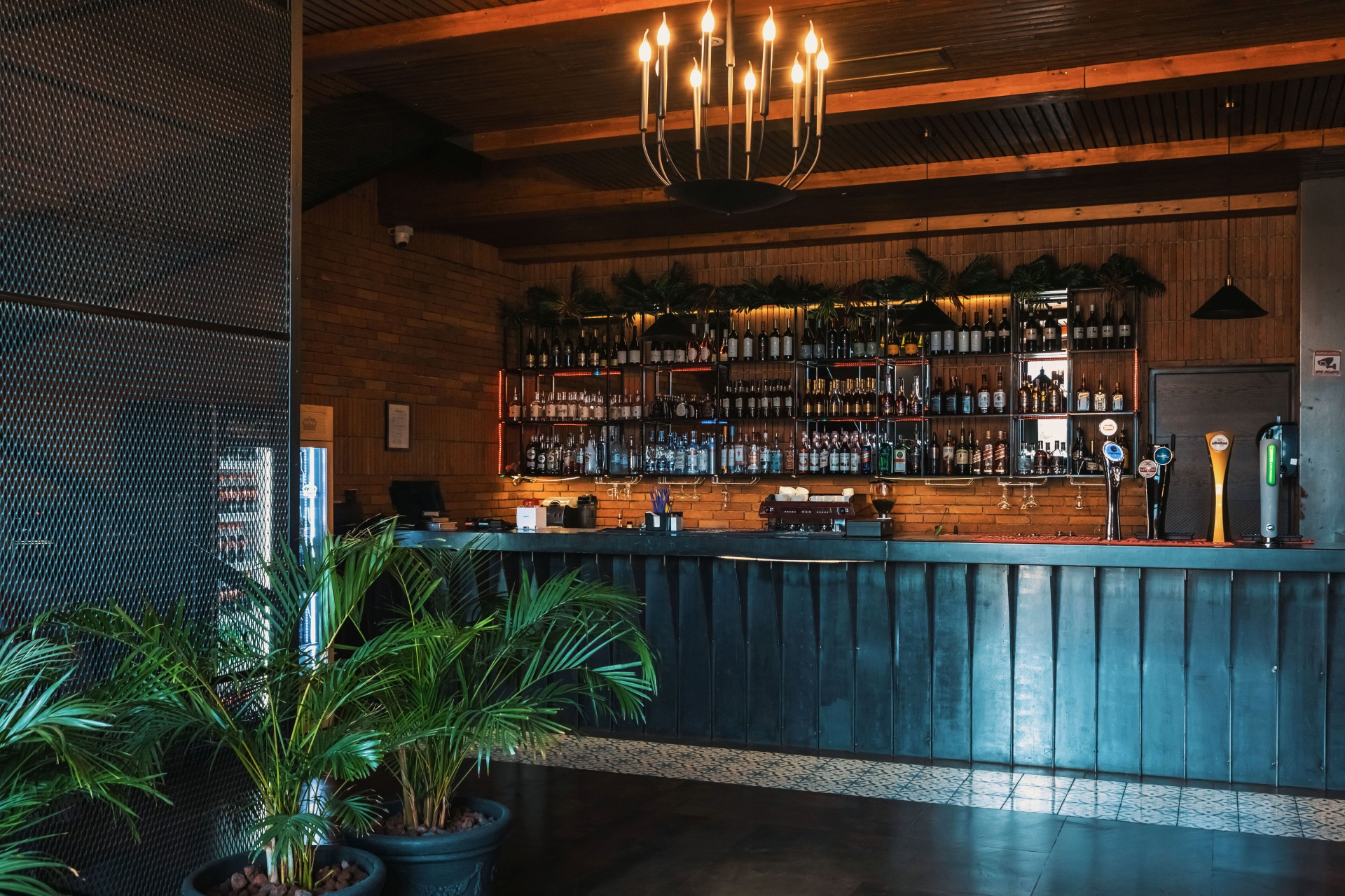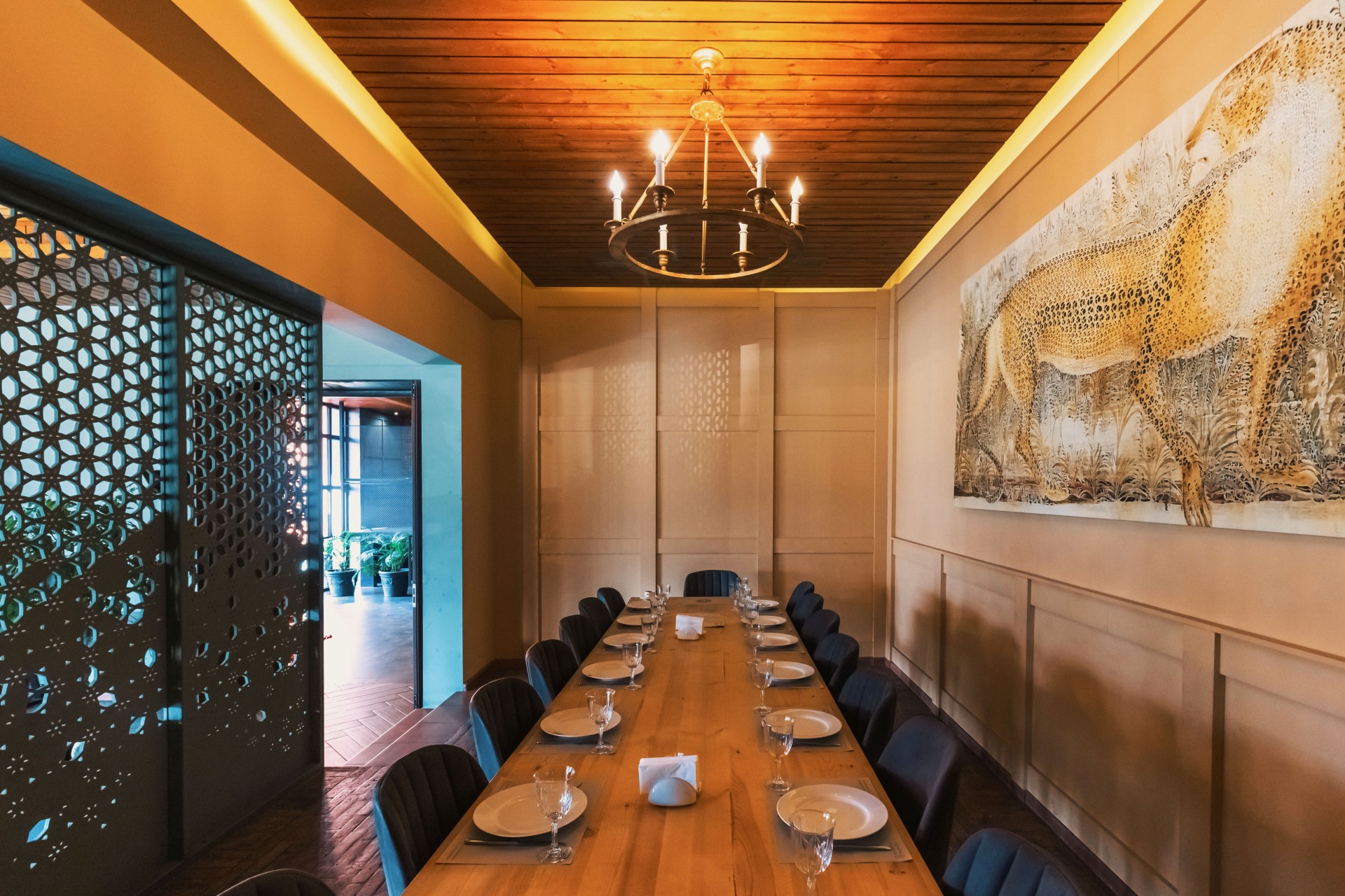 The interior color palette is dominated by warm, earthy tones that evoke a sense of comfort and coziness. Natural materials such as wood and stone, combined with metal accents, create a balanced and layered aesthetic that feels both timeless and contemporary. This architectural project carefully incorporates these elements to maintain a harmonious design. Common seating areas are carefully divided by decorative metal screens, creating a balance between communal and intimate spaces. The corridor linking different zones maintains a unified design language, ensuring seamless transitions between spaces within the architectural project.