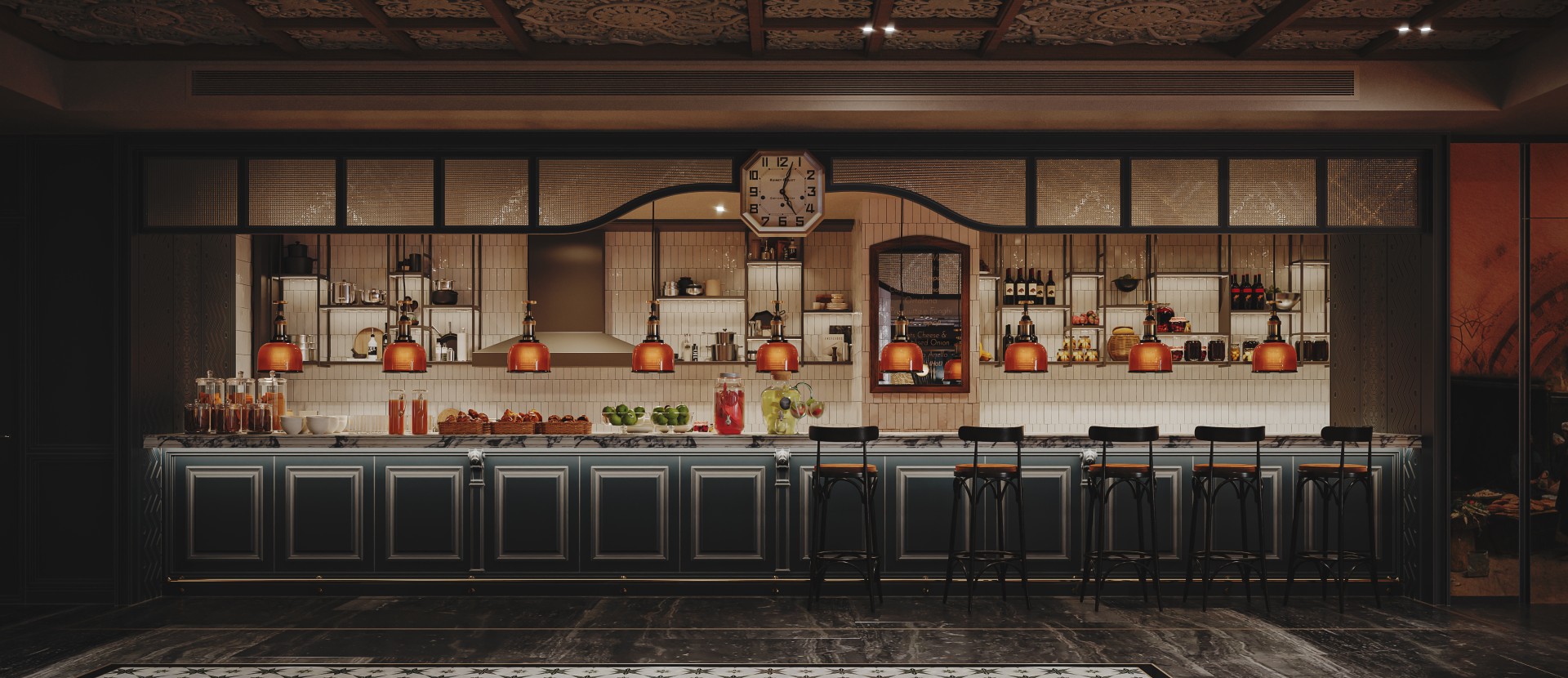 The bar design serves as a signature element of the restaurant, embodying a modern and intriguing aesthetic. It stands as the focal point and creates a striking first impression for visitors as they ascend the stairs. Decorative elements extend seamlessly from the bar to the ceiling, harmoniously enhancing the overall ambiance and creating a captivating atmosphere.