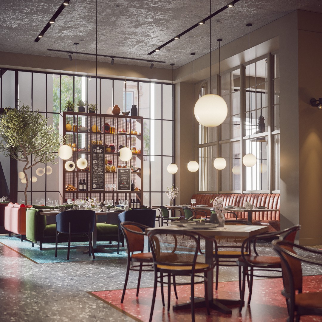 The main architectural feature of the restaurant is the glass ceiling. It maximizes natural daylight. This structural element reduces the need for artificial lighting. In addition, it creates an open and airy environment, a key characteristic of Modern architecture. The interior has spaces that include both individual and communal tables. It provides possibility of both private dining and group gatherings, which is a core aspect of Modern architecture.