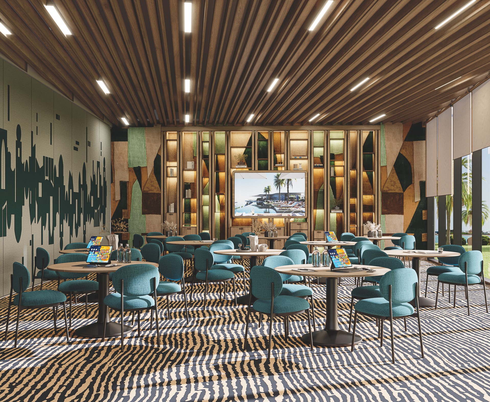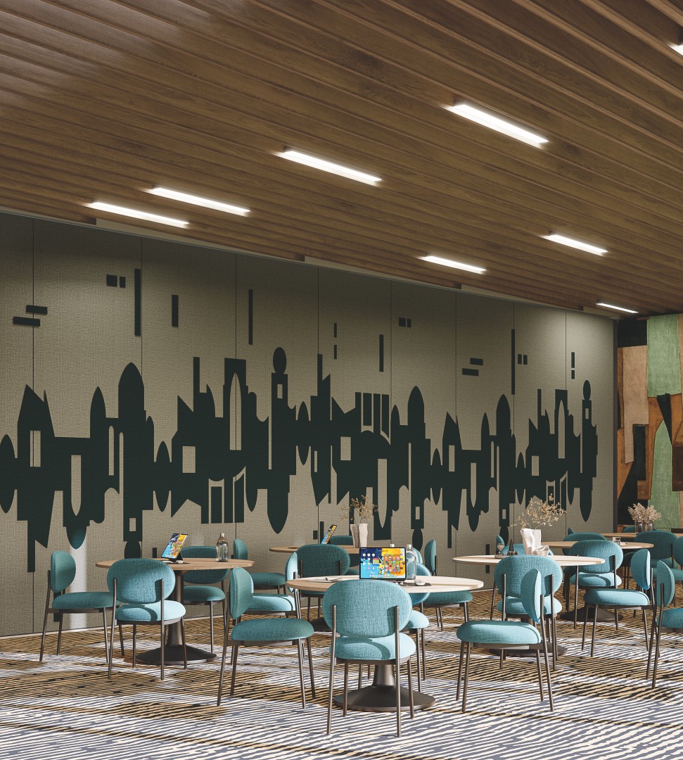 Yanbu's three defining souls are beautifully depicted through wall decorations featuring acoustical panels, creating both visual intrigue and effective sound control. These artistic elements serve as a storytelling medium, connecting the interiors to the essence of the location and enhancing the guest experience.