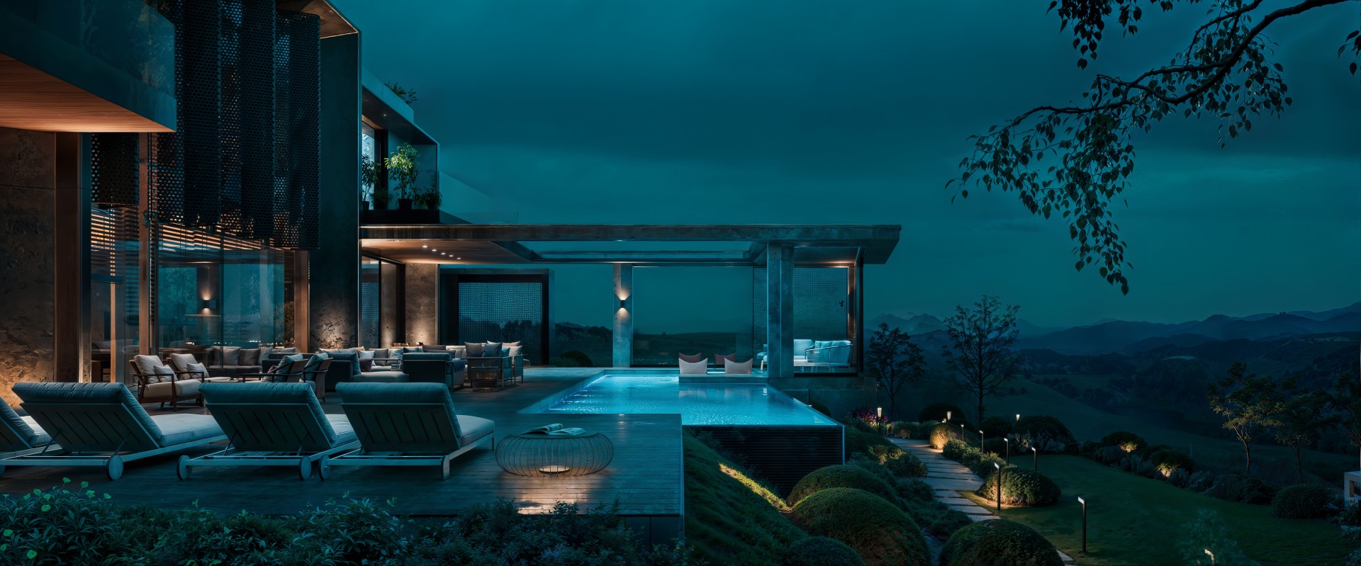 One of the villa’s most striking features is the floating terrace and swimming pool, elevated and perfectly aligned with the surrounding mountain horizon. Glass balustrades and light-permeable screens enhance the feeling of openness while maintaining privacy.