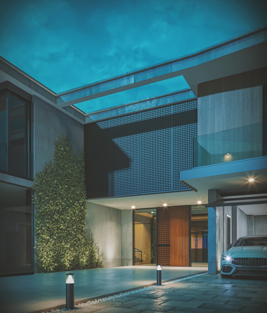 The home’s spatial planning maximizes vertical expression through two-meter atrium ceilings and full-height accent walls, amplifying the perception of height and volume. Vertical gardens and climbing plants blur the lines between built form and foliage, adding a dynamic, ever-changing layer to the façade.