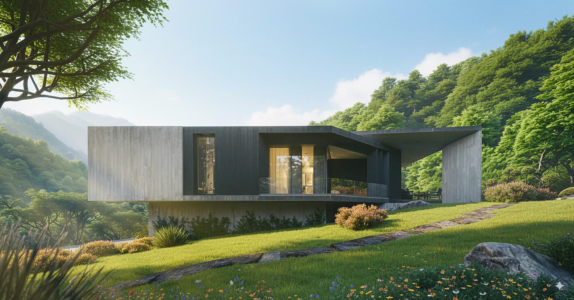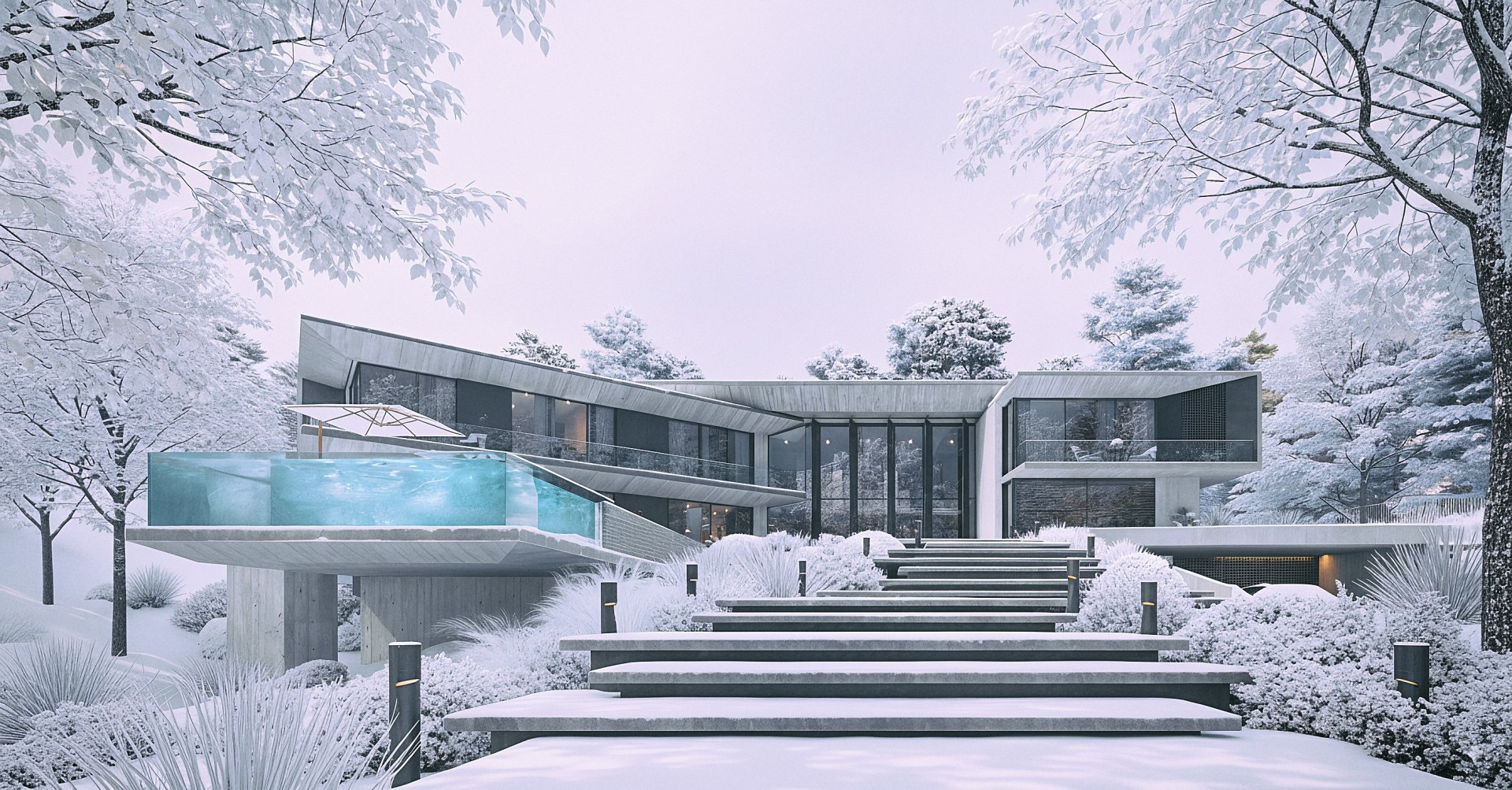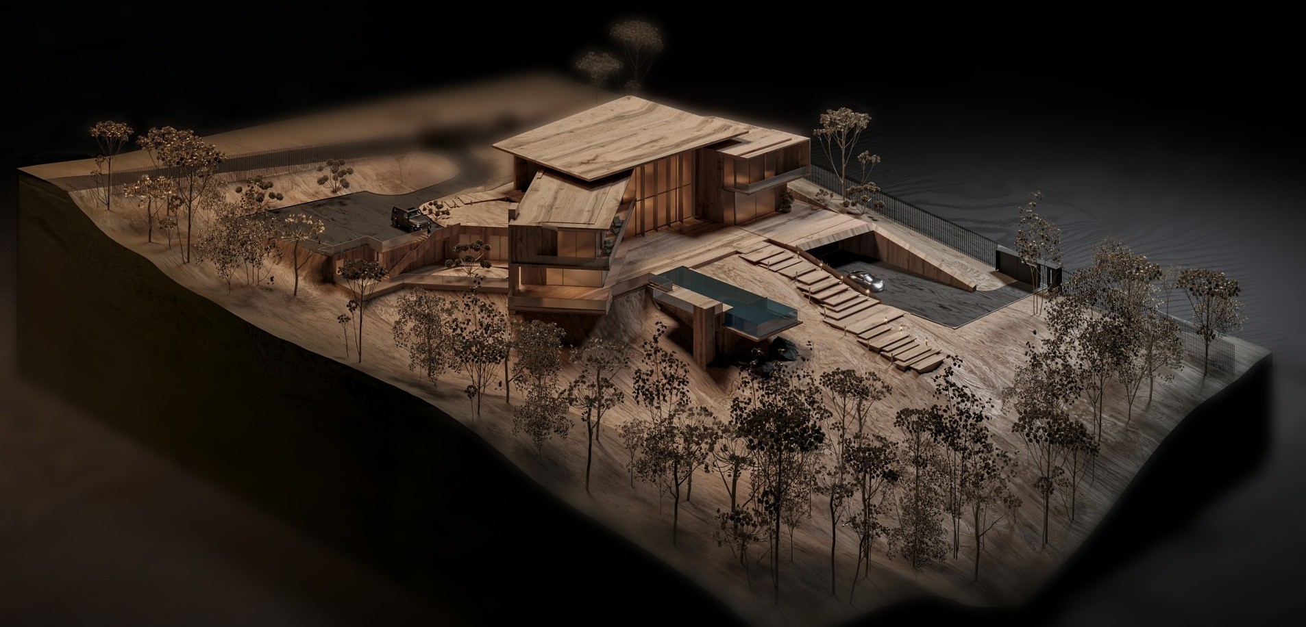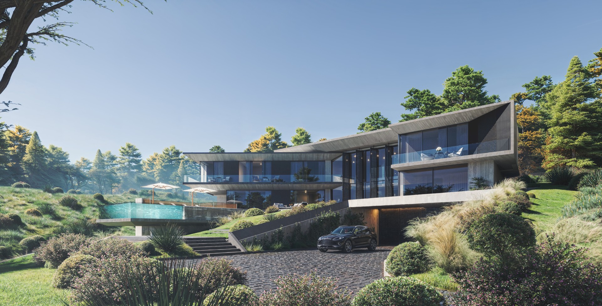 The architecture is defined by daring geometric forms and structural cantilevers. One of the key highlights is the infinity pool with glass walls on three sides. The pool visually extends the house’s horizontal lines into the landscape and opens towards breathtaking views of both the city and surrounding nature. The material palette emphasizes harmony with the environment: exposed concrete and metal create a bold, industrial character, yet their raw textures do not dominate the greenery.