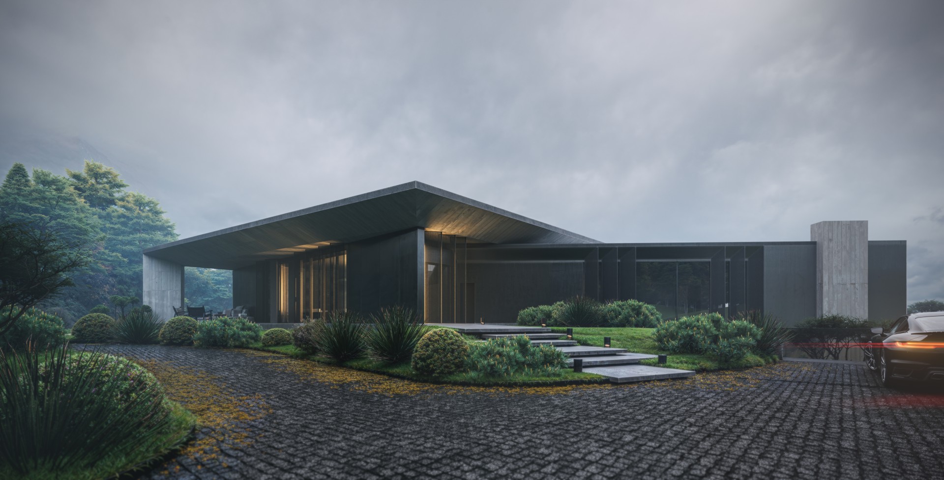 The project is located on a challenging sloped terrain divided into three levels. Each level has direct access to the natural ground, giving the building flexibility, spatial diversity, and integration with the landscape. One of the levels — the garage floor — is embedded into the ground on three sides and is only visible from the entrance side. This solution significantly reduces the visual volume of the house and enhances its harmony with the environment, allowing the natural landscape to remain the dominant element. Vision and Concept The architectural vision is based on a fusion of modern minimalism and industrial style, resulting in a high-standard residence that is organically embedded into nature yet retains a bold and distinctive character.